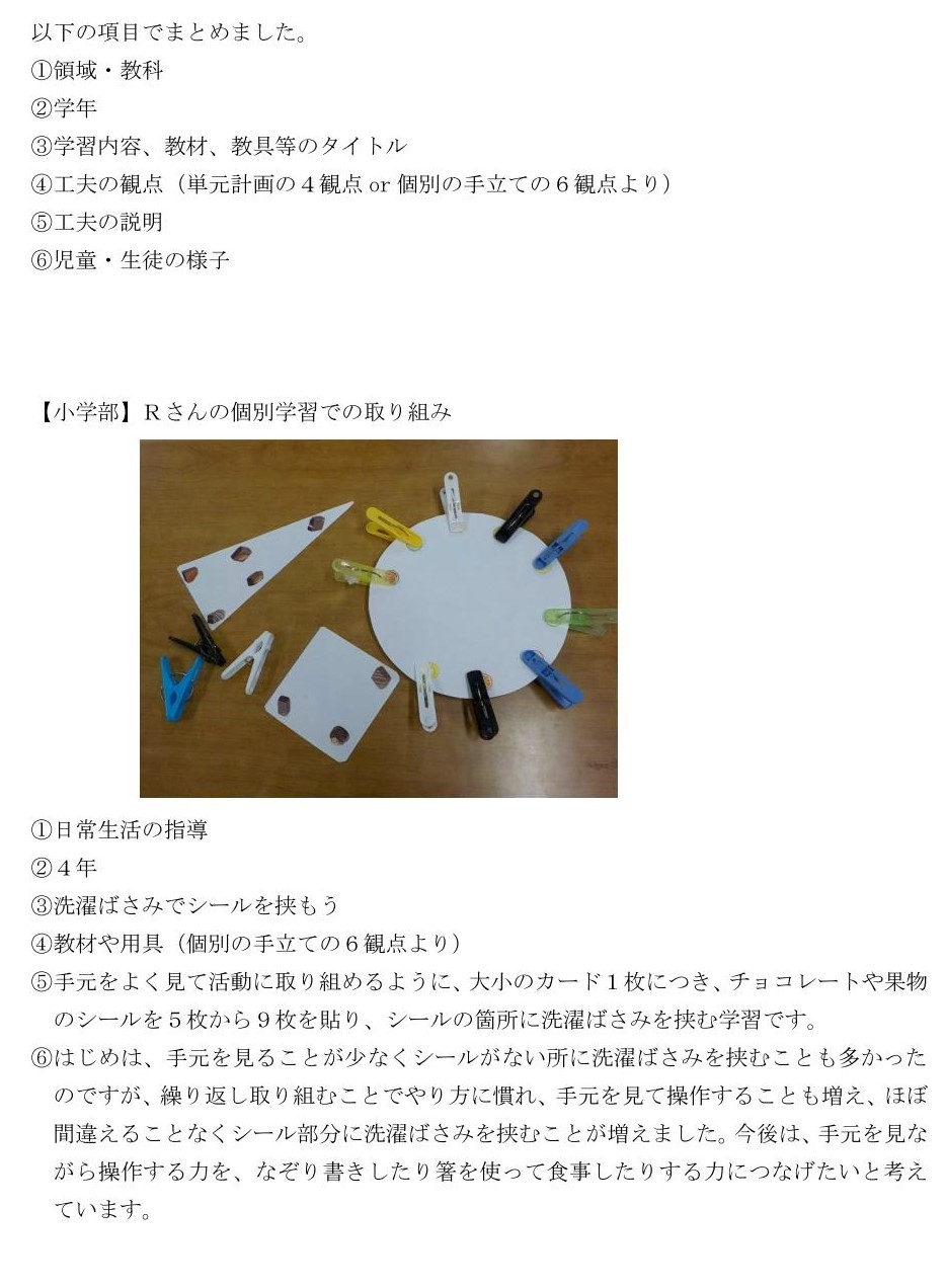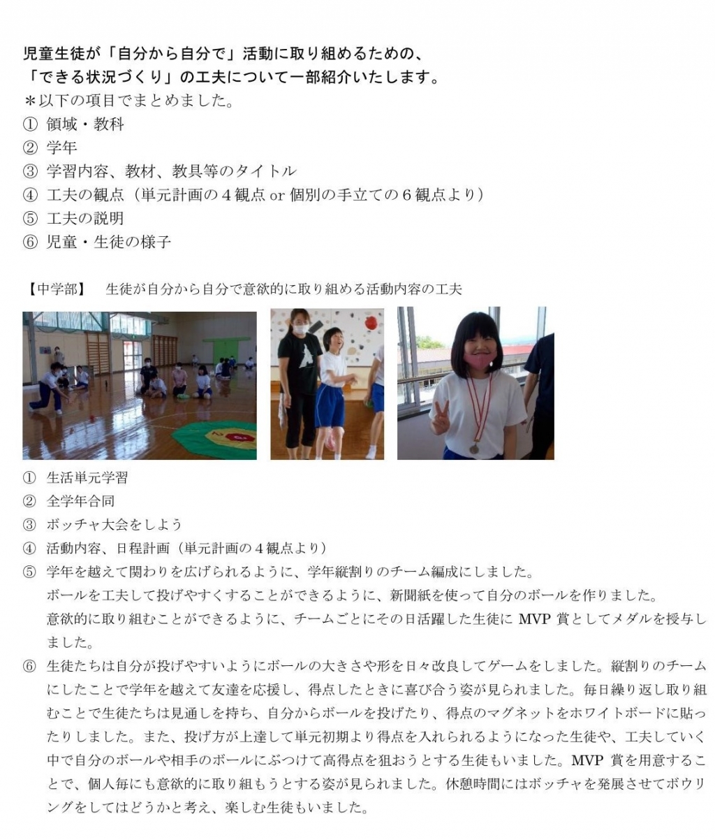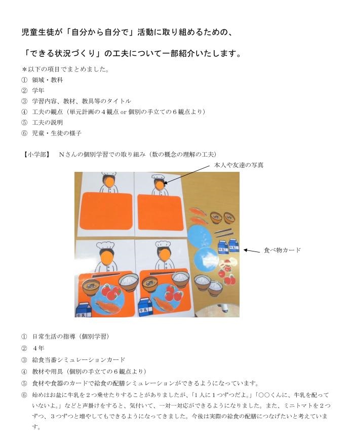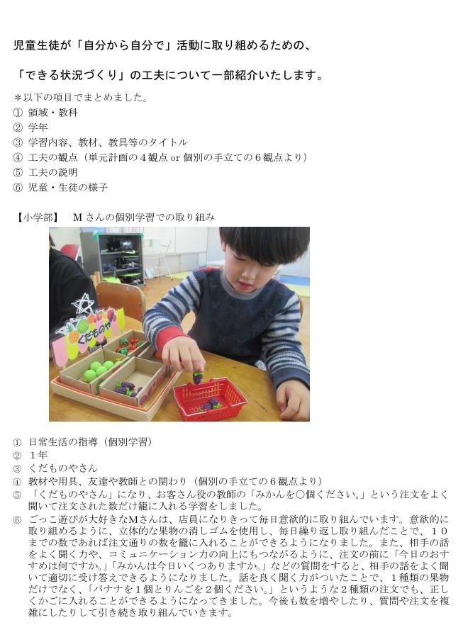 2020年3月4日 09時46分児童生徒が「自分から」「自分で」活動に取り組むための「できる状況づくり」の工夫について紹介します。 以下の項目でまとめました。 ① 領域・教科 ② 学年 ③ 学習内容、教材・教具等のタイトル ④ 工夫の観点(単元計画の4観点or個別の手立ての6観点より) ⑤ 工夫の説明 ⑥ 児童生徒の様子
