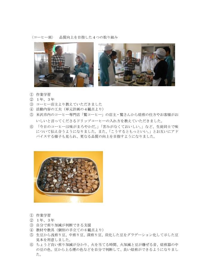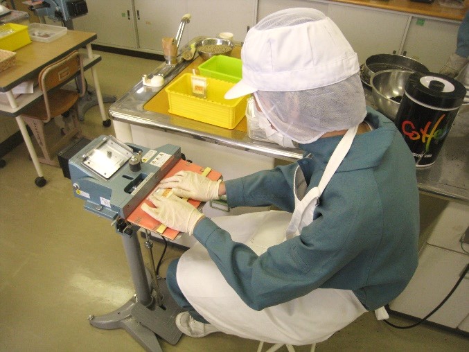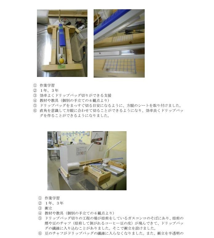 ① 作業学習 ② 高等部コーヒー班 1~3年 ③ 外袋をまっすぐに閉じるためのガイドの工夫 ④ 「教材や用具」 ⑤ まっすぐに閉じることができるように、足踏み式シーラーの作業台部 ⑥ 作業台部分のガイドに外袋の底辺を合わせることにより、外袋の上部 |