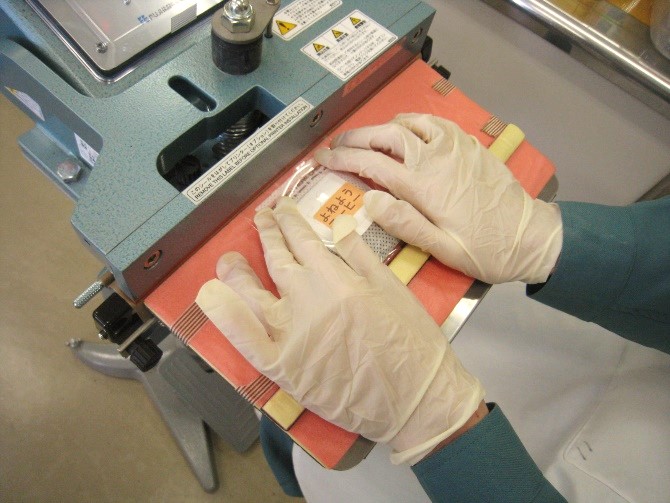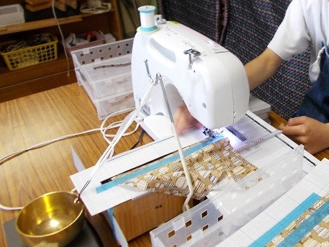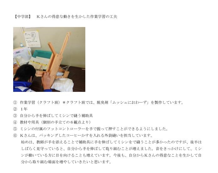 2019年7月22日 18時17分| 【中学部】 Kさんが自分で取り組める作業学習の工夫 ① 作業学習(クラフト班) *クラフト班では、コーヒーかすを利用した脱臭剤「ムッシュにおわーず」を ② 2年 ③ ミシンでの縫い終わりが音で分かる補助具 ④ 教材や用具(個別の手立ての6観点より) ⑤ 縫い終わりの位置で鐘の音が鳴ることで、自分で止めることを分かるように ⑥ 脱臭剤の布袋を、ミシンで縫う工程を担当している生徒です。 縫い終わりに気が付かずに過ぎてしまうことがあり、その都度教師が声掛け |